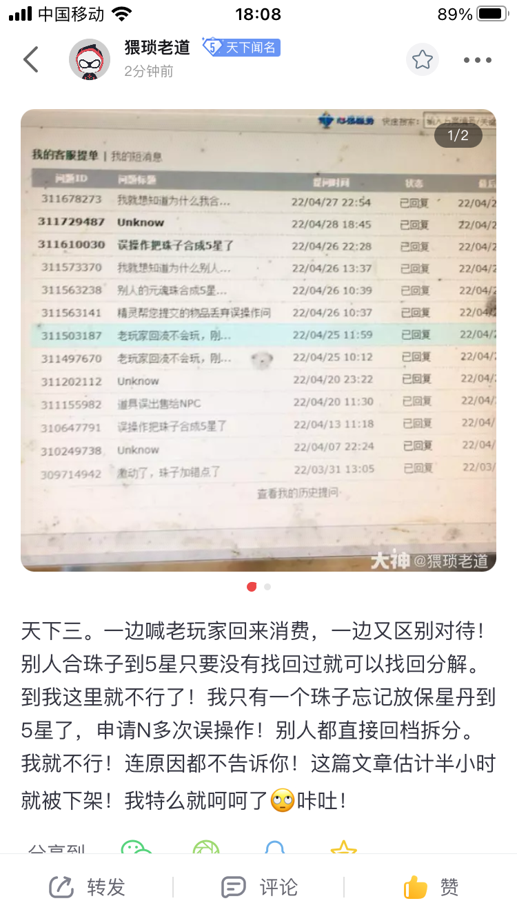 刚开区合个珠子忘记放保星丹给上了5星。别人直接找回。我申请N多次!就是说不行!电话kf 都说可以找回。只要没有找回过就行!我就不明白了!为什么我就不行?!搞的跟开黑f的gzs 一样!不怕别人笑话么?!