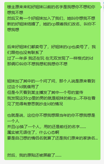 巫鈅微丘 发表于 2022-5-15 12:38 你说太多了 我没怎么看懂但是我姐妹确实是去私聊过 主楼也说过 加的是男的 他没承认自己是原来那个人用的原来的名字 只是说看到过就借用了 如果他直接承认了我们或许还不会那么无语 但是明明就是原来的人为什么要不承认?按你说的都记不得我们是谁了 那为什么不直接说他原来就是叫这个名字的现在继续叫而是说他仅仅是借用名字而已 我发现这件事情还是因为看到了他的麦号广告 并且在我这里恶心和心里不舒服是分不太清楚的哈 要真是借用名字的我今天根本不会来发这个帖子 但是原来亲友团的人 跟别人用原来我们想出来的还有点儿意义的名字 就算不是跟现任是跟朋友用的 我一样会很无语 而且,说实话,不杠不喷,你说这么一大串表示你很不理解我,我也有点不太理解你…… |