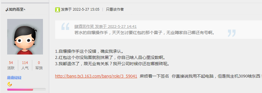 肆酒苦作笑 发表于 2022-5-27 16:47 你觉得我BLX那就BLX呗,我炸你 我也BLX 我都信了 哈哈 |