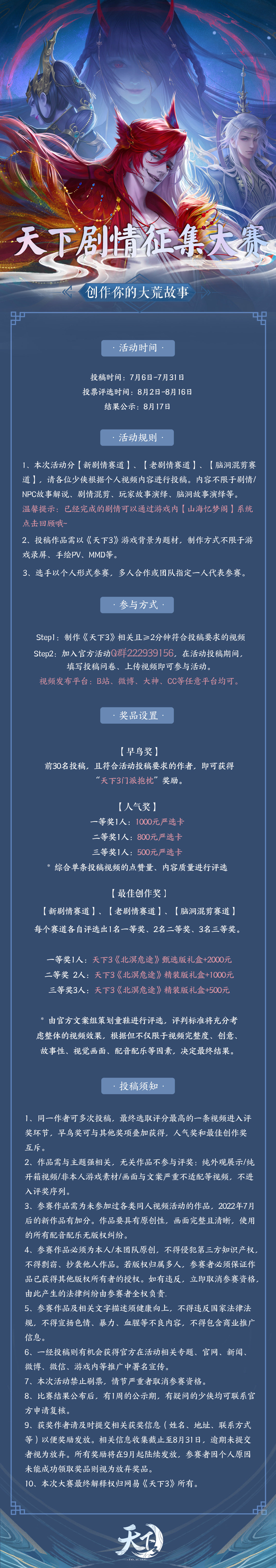 你可曾忆往昔岁月,怀念大荒故人? 或为剧情里的角色不甘,想要赋予他们新的命运? 亦或突然脑洞大开,想象一出狗血情景剧…… 你想成为讲故事的人吗? 这次,由你来编剧, #天下剧情征集大赛# ...