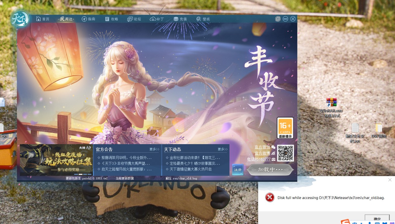 试着删除D:\天下3\Netease\tx3\download\ 里面的*1051.*和*1052.*,