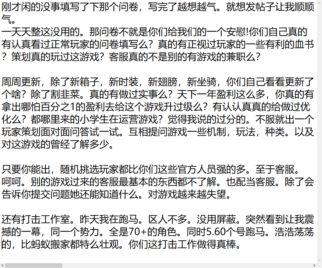 | 我也是提过一些。结果全都是石沉大海。很多玩家也是希望大荒变好。但是感觉官方……我们只要钱。你们好不好跟我们有什么关系。正常点上下班,拿个年终奖。这才是我们的追求。反正就算我们不弄这些,也会有人乐意充钱。 |