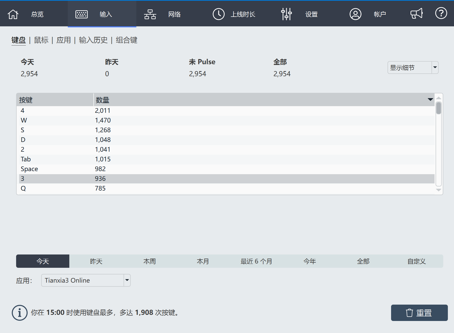 今天突然想看看我平时战斗的时候都用什么技能最多,哪些按键几乎不用可以富余出来干别的,然后就用软件统计了一下我的按键数量,打了六七局战场,得出来这个结果,4是火炎凤,2是小火球,3是火三~标准的重击YL打法啊 ...