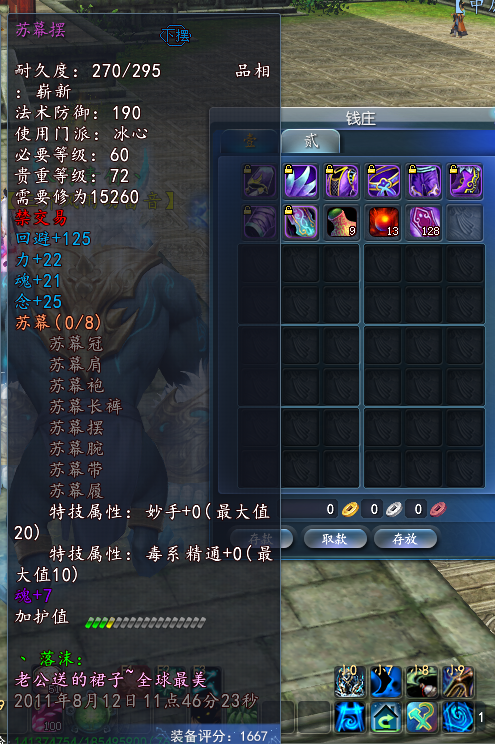 才买的号,发现仓库里有一堆“古董”。 比如瞧瞧这个苏木摆的签名时间。 2011年8月12日,那个时候60套摆应该不便宜吧。 妹子的游戏老公送的,那么当时( 丶落沫 )妹子一定很幸福吧。