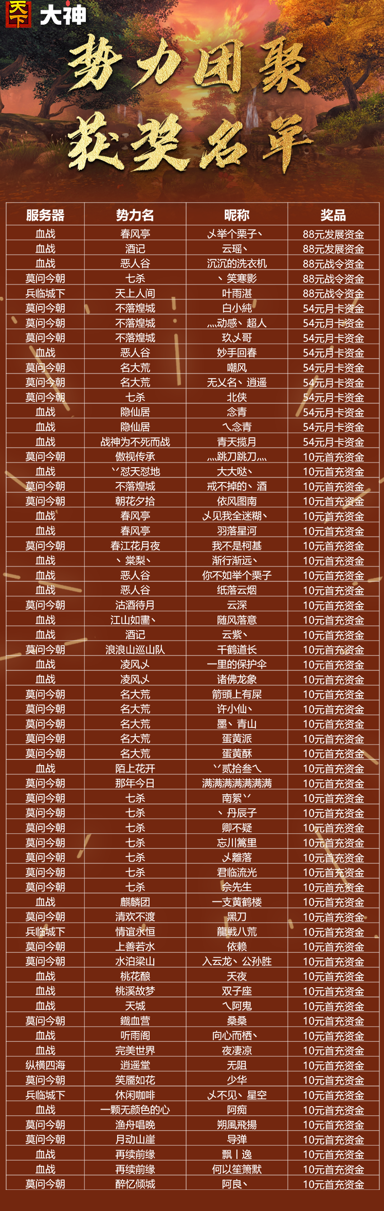 恭喜少侠获得缘聚天下老兵重聚启动资金,此现金奖励将于20个工作日内直接发放至中奖角色同帐号的大神“我的收益”中, 将大神APP更新至最新版本,点击APP界面右下角“我” 即可找到“我的收益” ...