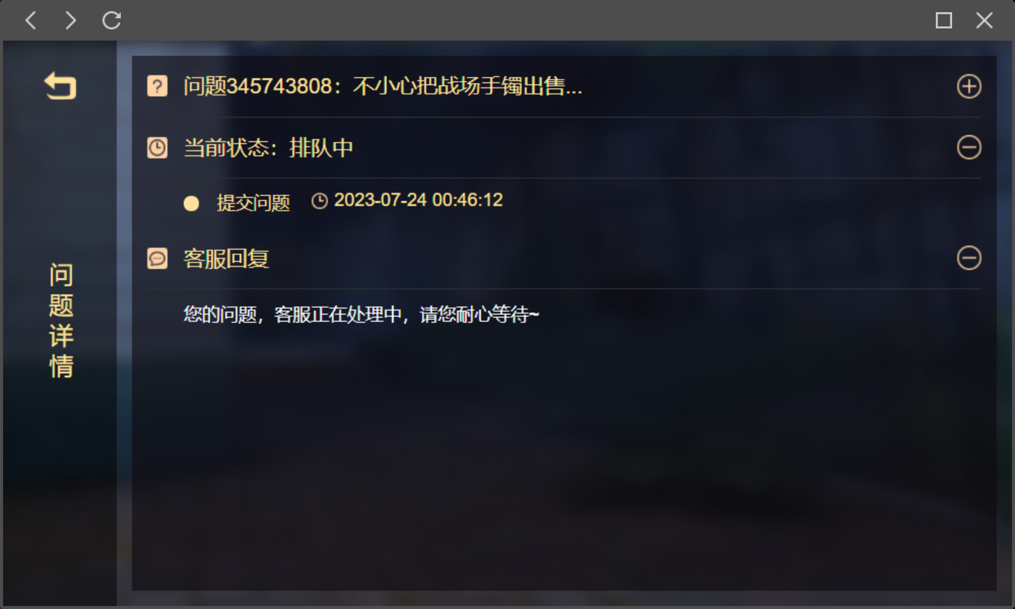 本帖最后由 lqbba 于 2023-7-26 16:49 编辑 事件:7月23日晚不小心把战场手镯出售给战场NPC商人 时间:2023年7月23日晚 服务器:兵临城下 角色:弹射起步 事情卡点:7月24日凌晨已经在游戏内右下次联系GM提交 ...