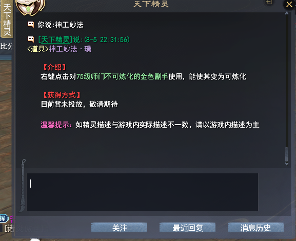 版主帮忙提下: 精灵查询:神工妙法·璞 对75师门不可炼化的金色副手使用,实际升级后无法对75金色副手使用,请版主提下尽快解决!谢 ...