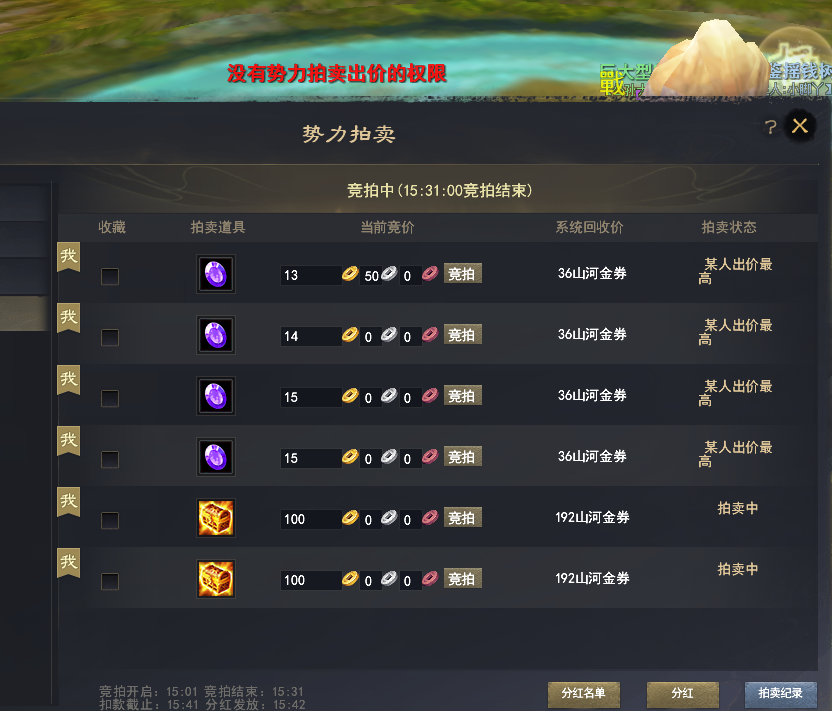 千叶蝶 发表于 2023-10-9 12:15 江苏 势力战参加了,台子也守了。两个拍卖都是这个提示。拍卖结束能分到钱但就是不能拍 |
