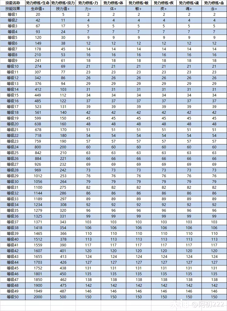 势力技能各等级对应属性值(搬运贴,原主:阿初222),需长期搬砖养号的朋友收藏即可目录:表1/6:势力修炼·生命、技力、力、体、敏、疾、魂、念;表2/6:势力修炼·天攻、地攻、物防、法防、天伤、地伤;表3/6:势力 ...
