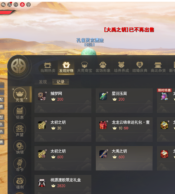 1.31开服之后买的大禹之钥600yb一组,买了一组开了之后出了4个阴阳碎片*10,打开之后就不见了...后来晚上再看道具商城就不卖了 然后1号再看打折400yb一组了 提了工单只给了模棱两可的正在查询的回复就结单了,到现 ...