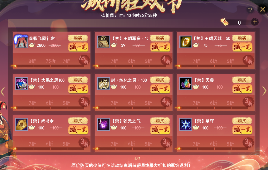 以前是公告会出介绍 然后每日活跃箱子有减价券 然后消费元宝也有减价券 现在啥也没有 咔咔的就给你整出来了 你还不知道 而且就1天 还是从0点就开始了 |