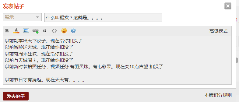 | 我之前不知道听谁说因为老板们不高兴了,嫌弃普通玩家白嫖的太多了,所以把这些东西都砍了,主打一个只有老板配花钱,其他人都不配 |