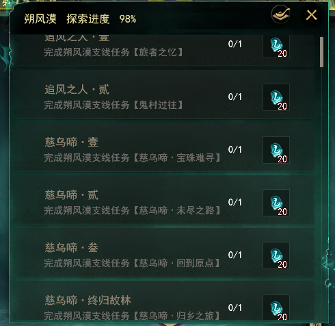 两个问题:①图2的追风之人和慈乌啼系列任务后面建立的号做不了,导致探索度到不了100%,卡在98%;②图3是后面建立的号(和2008同步)可以到达100%,但是以前跟着太古地图进程的老玩家卡在99%(探索进度里的所有任务 ...