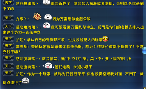 | 三封的计划是这样的,让护短这帮人拿中立开刀,逼迫中立去两边打架,然后高端号有了体验,更多高端号入局,中立和高端号为了打架搞装备,烟花有了消费,他拿比例分成。但是,以为弄个护短就能逼迫中立给高端号当炮灰送人头?有点弱智了。就好像去年一意孤行要求三个区合区,结果启天死了。现在的策划也不行了,不然也不会偏信三封的馊主意。护短是什么人,去年烟花大战原地反水,三封安排他到对面当007,然后再原地反水,一塌糊涂的人。 |