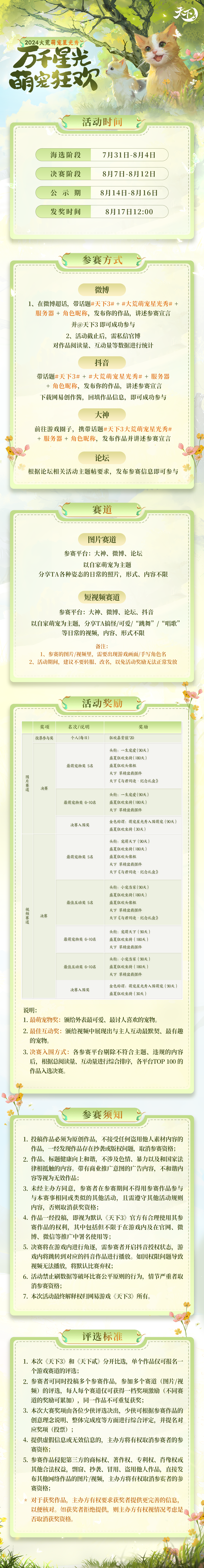 请各位少侠根据自身情况,选择想要参加的赛道发帖。 主题贴需带下方各自赛道前缀: 【天下3-萌宠星光秀】#天下3#赛道 【天下贰-萌宠星光秀】#天下贰#赛道 需按照推荐文案填写、服务器+角色昵称 及参赛宣言,如错 ...