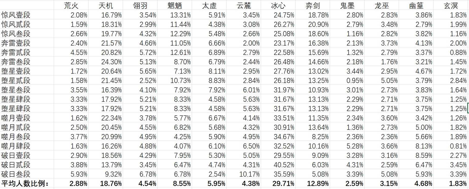 这种平均结论数据误差极大的。。就像28定律,你80%的击杀数可能都是顶端那20%的人的数据。 建议直接看至少噬月2以上的数据。 另外弈剑这数据单独调侃说下,魂剑数据应该是全门派都可以名列前茅的,但物理剑就是拖油瓶,平均一下还是这么拉,估计是底端物理剑太多了,拖垮了魂剑。真要看破日的,其实弈剑数据应该还不错,当然里面大部分都是魂剑,与物理剑无瓜。 |