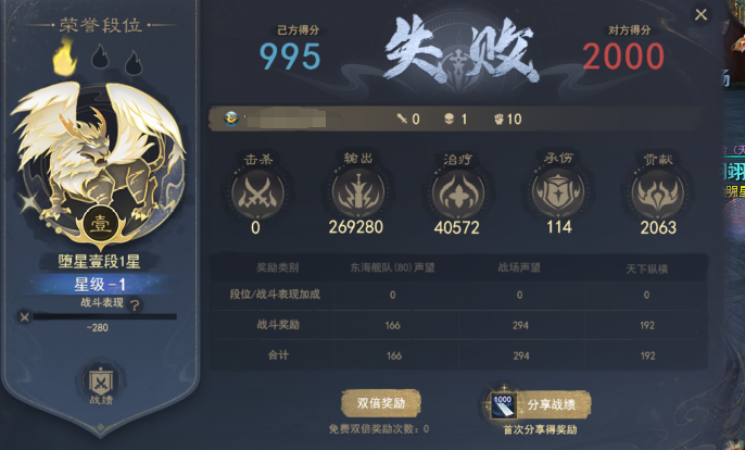 | 不是,你这数据也不行啊! 说是大逆风,你只死了一次, 说是大混战,你才10个助攻, 而且贡献属于中等偏下,这点声望是有点少,但就算是之前的傲斗,这种贡献输了也就200多点声望。 |