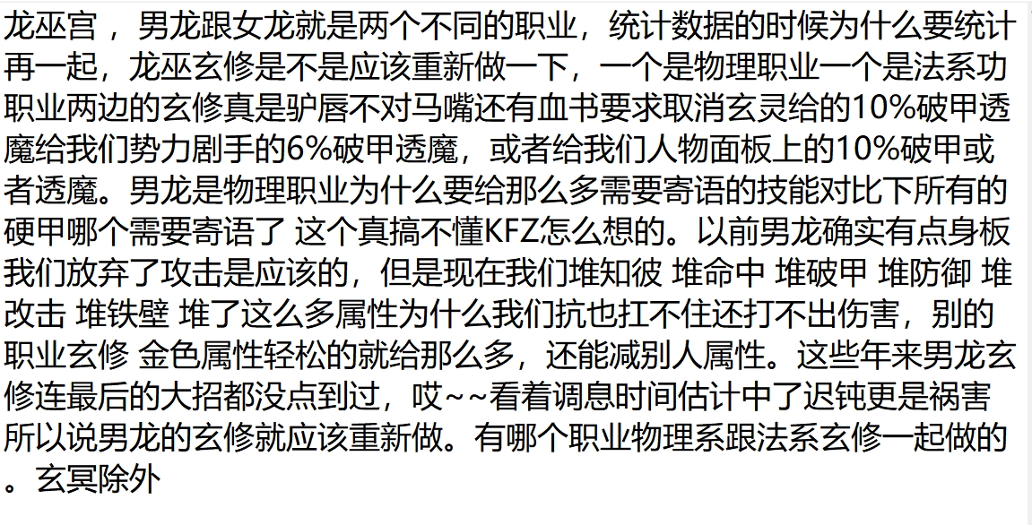 | 虽然不玩龙巫了,但是男龙从出生到现在玄修都点不到大招,太过分了!身板完全靠牺牲攻击端去堆,同样的投入,放在天机身上能直接起飞,男龙依然是个下水道。 |