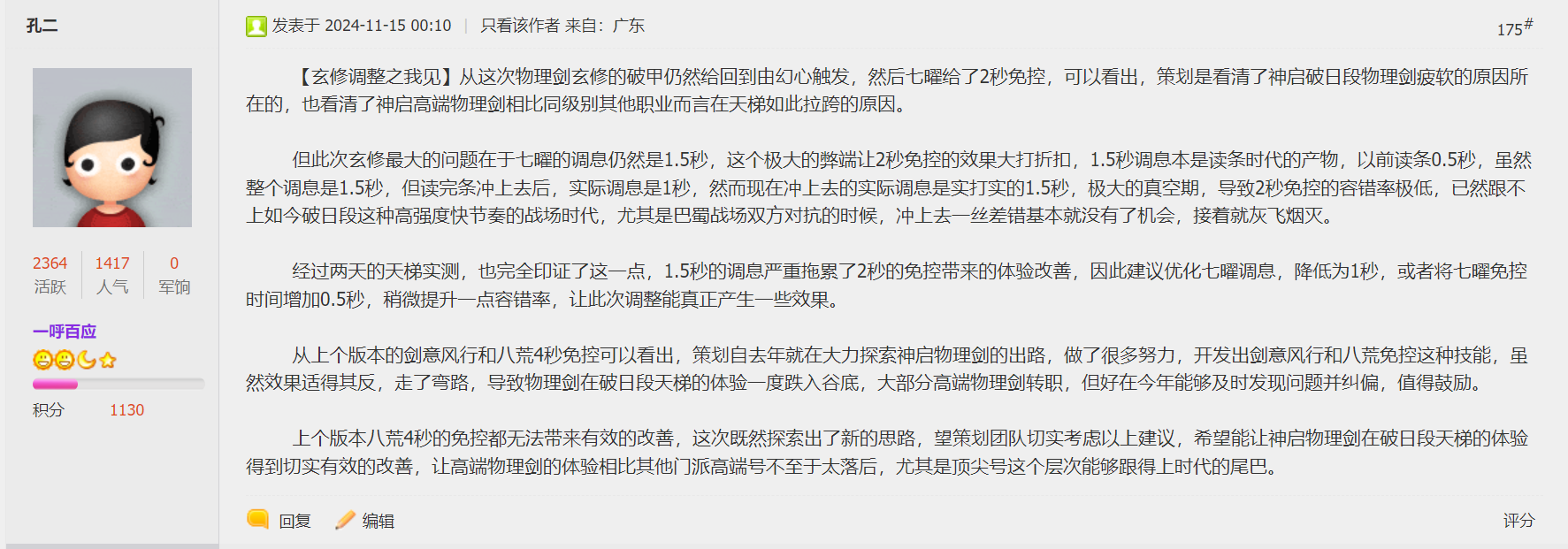 给我们弈剑七曜2秒免控已经被喷的体无完肤了,再延长时间估计会被血书,他们都是按照,七曜2秒免控,归元刷新,再控2秒,一共4秒时间,归元+七剑的伤害没什么职业扛得住,物理剑人均 归元5W,七剑10W伤害, 现在玄修这么改,八荒4秒免控移除,物理剑是真真坐实了刺客职业了,打团是根本不能允许进场了,孤儿职业,有锁头的能多打一个两个技能的另说,那些喷子是真的一点不看实际战斗情况就乱喷的 |