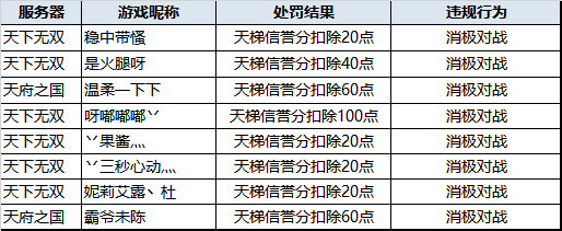 截至11月25日,我们收到了玩家对于天梯战场异常行为的举报,在核实具体举报信息真实性后回溯了被举报人员的天梯数据。 发现部分玩家确实存在天梯异常行为。 处罚公示如下: 望上述玩家引以为戒,如有再 ...