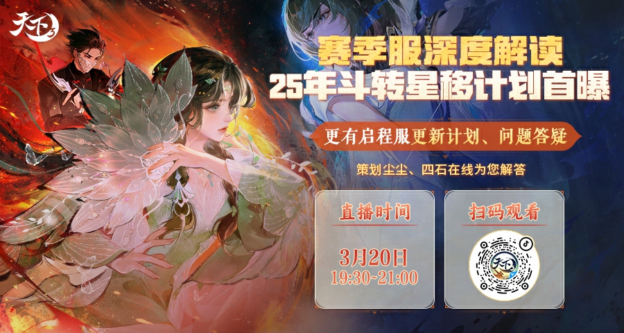 《天下3》赛季服详细解析,斗转星移计划首曝 今晚19:30锁定《天下3》官抖直播间策划尘尘和四石将在线为少侠们详细讲解,欢迎少侠连麦答疑~赛季服玩法、奖励讲解斗转星移第二期机制爆料启程服后续更新计划