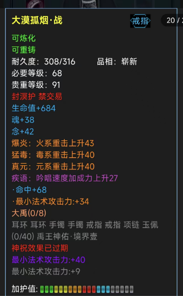 我大禹戒指转换,他们的bug原因导致我无法无法互转,只有恢复以前版本戒指,结果第五条金属性没了,现在就一直没了,随缘白嫖洗了几个月,也没啥结果,爱出不出吧 |