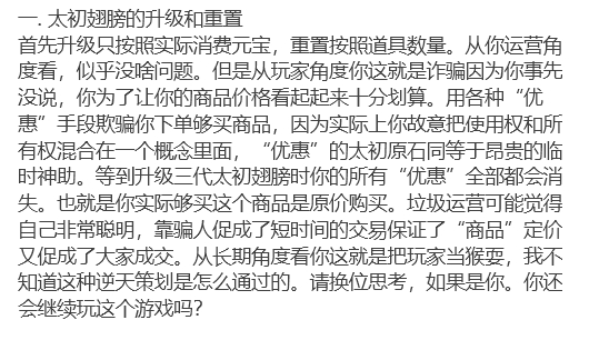 太初翅膀是网易筛选老板的验金石。游戏在精准定位老板,想做到把脉一样的收割,当然也会回馈给老板更周到的服务。阶级定位让说明游戏的消费降级。 所谓的升值都是骗你没商量的谎言。 太初翅膀的问题其实更像是个KPI的指标,今年在这个指标上打一个标签,年底收获一次年终奖,第二年再打一个标签,循环往复。工作既轻松,绩效也容易。 我认为太初翅膀的问题更是凸显了网易内部运作的现状,没人再考虑如何良心运作游戏,能保住饭碗就行了。去年的贪腐后遗症还没消散完,BUG一个一个出来,说明交接后门留的多。 为什么公告跟解释自相矛盾,说明团队考虑问题非常不成熟,也凸显了不负责任。也许内部离职率很高,人人自危。 |