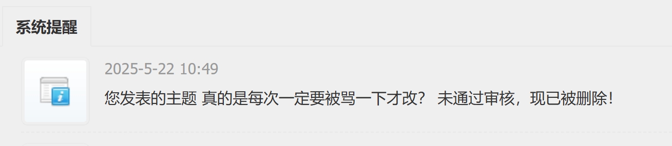 | 哈哈哈哈,我的也被删了。都没骂人,只是质问这种机制搞人心态,就被审核不通过 |
