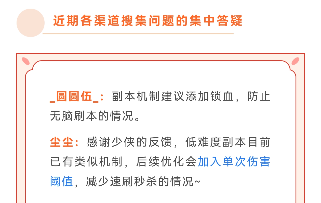 有人明确提过建议给“低级、简单副本增加一键扫荡功能”被拒绝, 然后有人模糊的提出副本机制增加锁血就自然而然的联想到低难度副本了, 尘尘的脑子里面考虑的根本不是出高难度副本增加PVE乐趣, 满脑子只有限制玩家单刷简单副本白嫖奖励 |