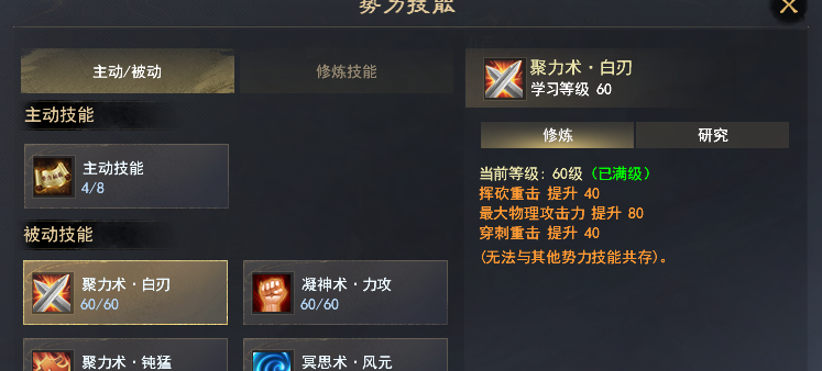 我刚看了下 打开技能(如果没设置默认是P键)-势力-被动技能-右击激活