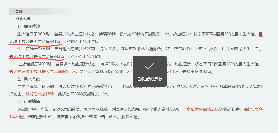 又是要下周才修复吗??热血狂沙的1,2级加最大生命值的3%最大物理攻击,还有玄灵的易水悲歌格挡一次致死伤害,使该伤害降低为1点。 就真的不能正常按照描述做代码吗?每次都不一样,程序员很不喜欢天机吗? |