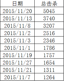 前言 自10月中旬笑看重燃激情以来,敌对双方阵营摩擦不断,虽规模较小,总归聊胜于无。11月梦境对推并不多见,但劣势一方逆袭所属情谊烟雨阁挑战中立联盟勿忘初心双恋势力,可谓闹得沸沸扬扬,局势发展尚属未知,逆袭方再次陷入逆风状态似乎已经命中注定。期待事态升级、战事激烈化!现整理11月梦境击杀数据如下 ——11月份流光梦境战事图表分析—— 下图为11月份笑看风云流光梦境产生击杀数前十的天数