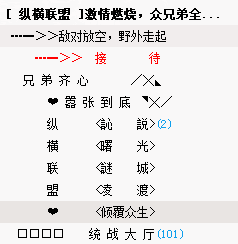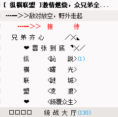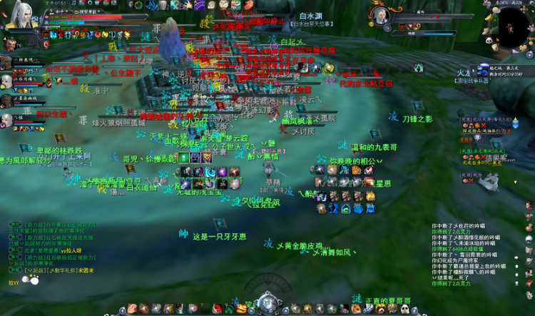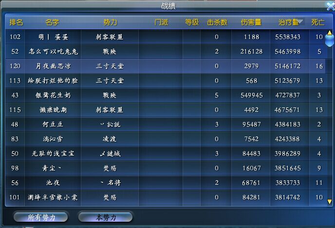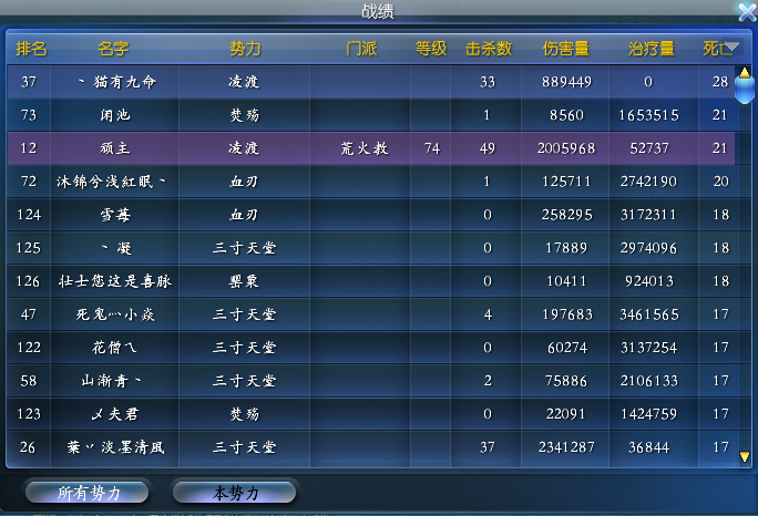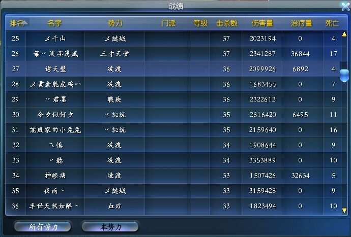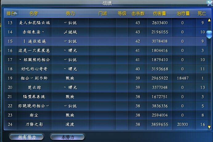 【精彩截图】 【占领情况】 氐巫寨:凌渡(纵横) 木克村:焚殇(逆袭) 石林:丷訫説(纵横)白水台:血刃 盐泉村:丶曙光(纵横) 五彩池:凌渡(纵横) 八卦田:花嫁(中立) 丹坪寨:戦殃(二线) 古皇陵: 丷眷恋(中立) 侯马屯:倾覆众生(纵横) 鼎湖:丷依恋(中立) 红石峡:情谊烟雨阁(逆袭) 【战绩榜】 【击杀】