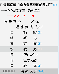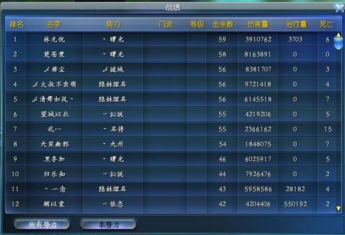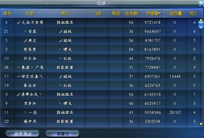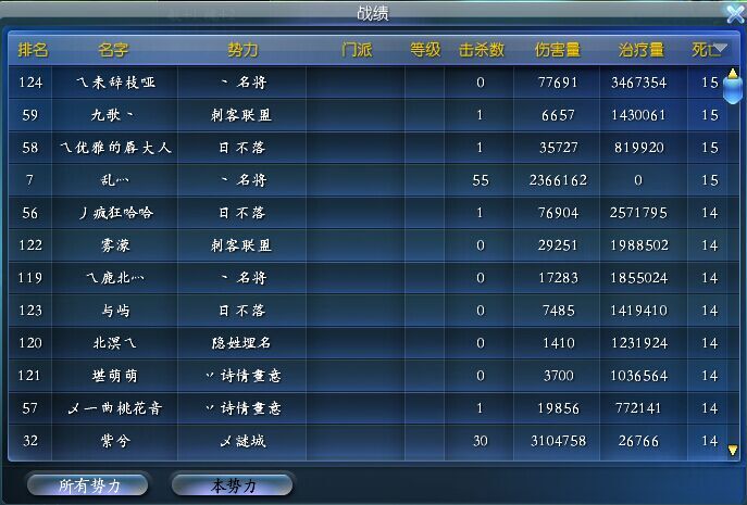 【势力战总结】 掉帧掉帧严重,1-80之间波动。。。从来跟不上大部队,今天真是绝了。。。 今天势力战,做为再一次改版的势力战,我只想说一句话: “我擦了个DJ,奖励8年不变,势力战越玩越『警告:注意文明用语!』” 时间看似短了,一个反攻却成了不定因素,自行脑补当只有几个冰心互戳时候 而且,反攻后离开祭天台区域,看自家人全红名。。。搞毛线 咳咳,回归主题,今天势力战,莫名的卡打得我也是蒙逼烦躁 纵横少见的占据人数优势,在势力战9点10分结束的时候,成功占据11座祭天台 反攻开始后,杀戮联盟连夺3座祭天台,纵横方表示丢的莫名其妙 再次奉劝笑看敌对双方各位兄弟,看公告,看公告,不然自己死了都不知道嘛回事。 最终,祭天台数量比:纵横:杀戮=8:4 顺便说一下,欢迎疯狂哈哈哈落地笑看,做为老敌对,对你印象颇深 哦对了,敌对的盆友,你们要感谢我把你们赵盟主送到你们身边不要总是刻薄的攻击我,要学会感恩 虽然你们攻击我,我也不会痛 【精彩截图】 给浪一个特写 今晚实在电脑不对劲,只能凑合几张了 【占领情况】 氐巫寨:丶曙光(纵横) 木克村:丶曙光(纵横) 石林:丷訫説(纵横) 白水台:凌渡(纵横) 盐泉村:凌渡(纵横) 五彩池:日不落(杀戮) 八卦田:丷依恋(纵横) 丹坪寨:隐姓埋名(杀戮) 古皇陵:乄迷城(纵横) 侯马屯:丷依恋(纵横) 鼎湖:隐姓埋名(杀戮) 红石峡:丶名将(杀戮) 【战绩榜】 【击杀】 【伤害】 【治疗】 【死亡】